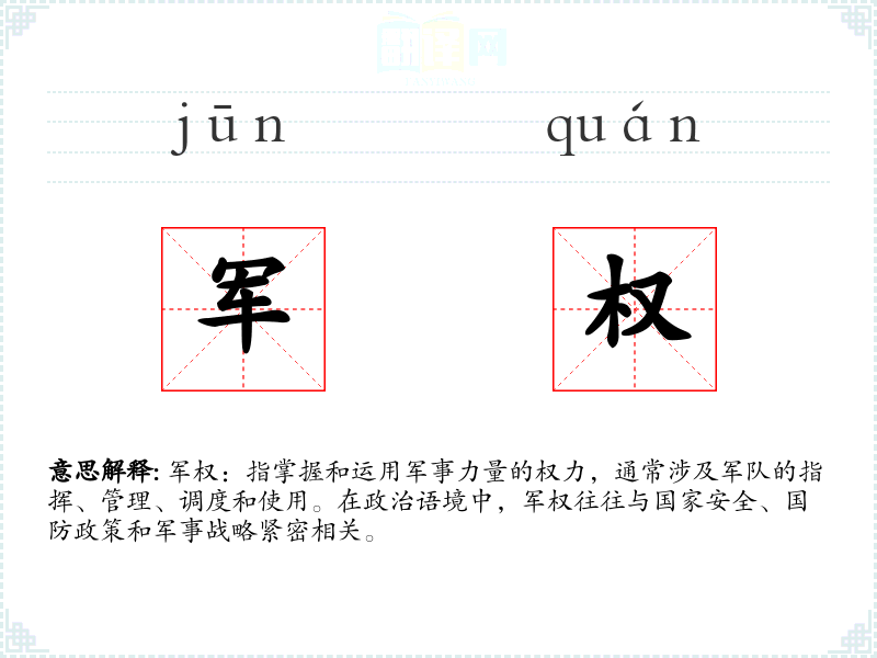 军权:指掌握和运用军事力量的权力,通常涉及军队的指挥、管理、调度和使用。在政治语境中,军权往往与国家安全、国防政策和军事战略紧密相关。