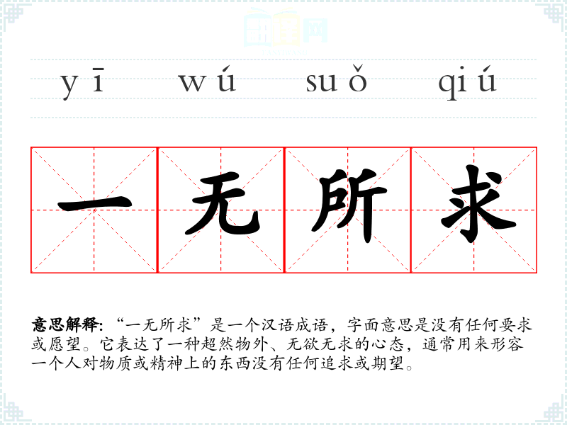 “一无所求”是一个汉语成语,字面意思是没有任何要求或愿望。它表达了一种超然物外、无欲无求的心态,通常用来形容一个人对物质或精神上的东西没有任何追求或期望。