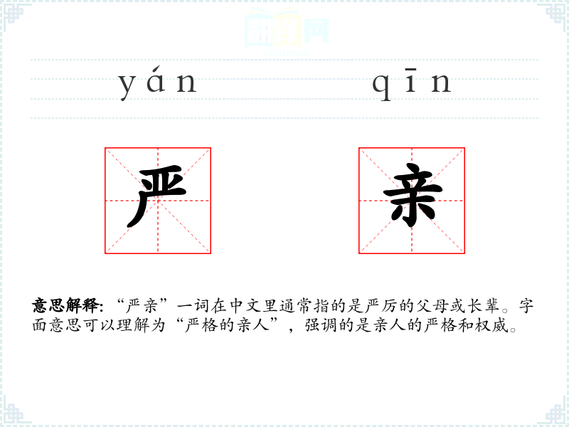 “严亲”一词在中文里通常指的是严厉的父母或长辈。字面意思可以理解为“严格的亲人”,强调的是亲人的严格和权威。