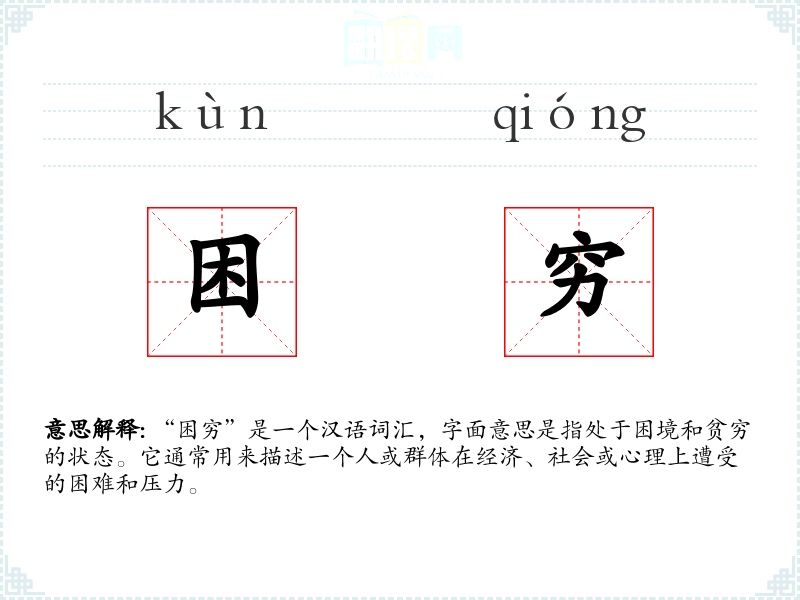 “困穷”是一个汉语词汇,字面意思是指处于困境和贫穷的状态。它通常用来描述一个人或群体在经济、社会或心理上遭受的困难和压力。