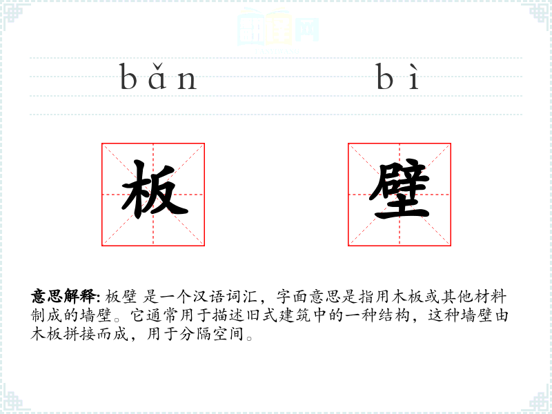 板壁 是一个汉语词汇,字面意思是指用木板或其他材料制成的墙壁。它通常用于描述旧式建筑中的一种结构,这种墙壁由木板拼接而成,用于分隔空间。