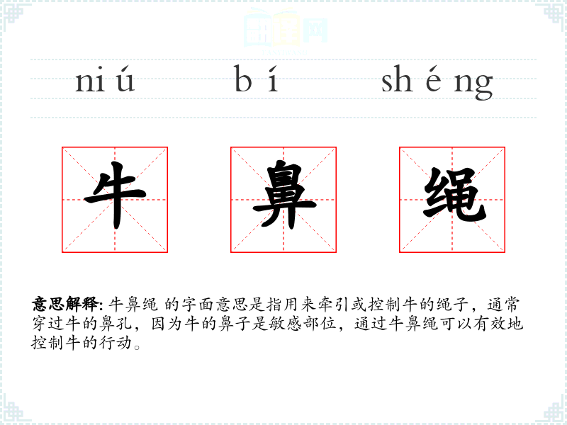 牛鼻绳 的字面意思是指用来牵引或控制牛的绳子,通常穿过牛的鼻孔,因为牛的鼻子是敏感部位,通过牛鼻绳可以有效地控制牛的行动。