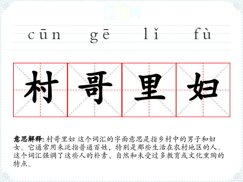 村哥里妇 这个词汇的字面意思是指乡村中的男子和妇女。它通常用来泛指普通百姓,特别是那些生活在农村地区的人。这个词汇强调了这些人的朴素、自然和未受过多教育或文化熏陶的特点。
