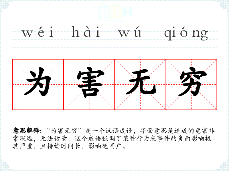 “为害无穷”是一个汉语成语,字面意思是造成的危害非常深远,无法估量。这个成语强调了某种行为或**的负面影响极其严重,且持续时间长,影响范围广。
