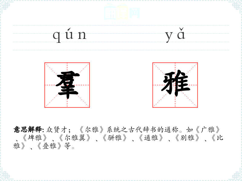 众贤才; 《尔雅》系统之古代辞书的通称。如《广雅》﹑《埤雅》﹑《尔雅翼》﹑《骈雅》﹑《通雅》﹑《别雅》﹑《比雅》﹑《叠雅》等。