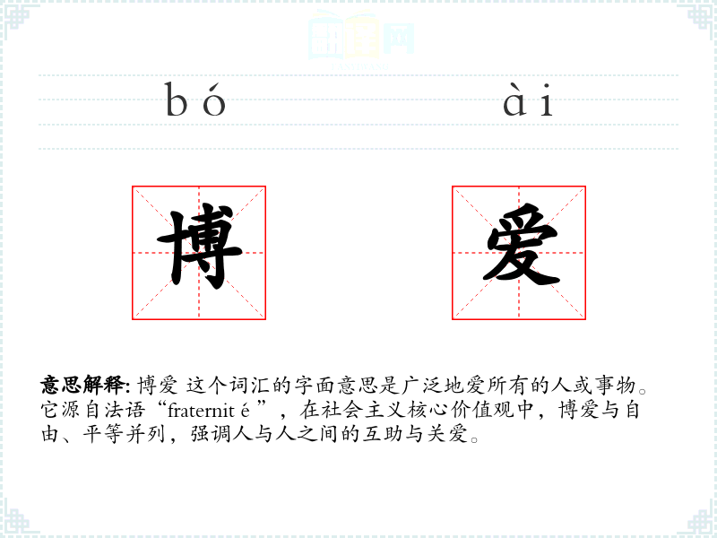 博爱 这个词汇的字面意思是广泛地爱所有的人或事物。它源自法语“fraternité”,在社会主义核心价值观中,博爱与自由、平等并列,强调人与人之间的互助与关爱。