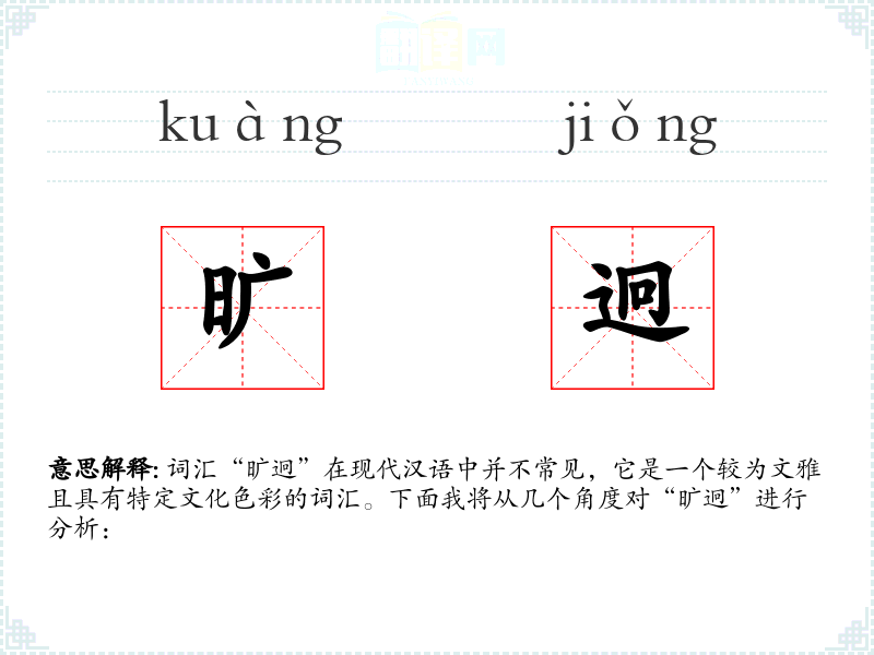 词汇“旷迥”在现代汉语中并不常见,它是一个较为文雅且具有特定文化色彩的词汇。下面我将从几个角度对“旷迥”进行分析: