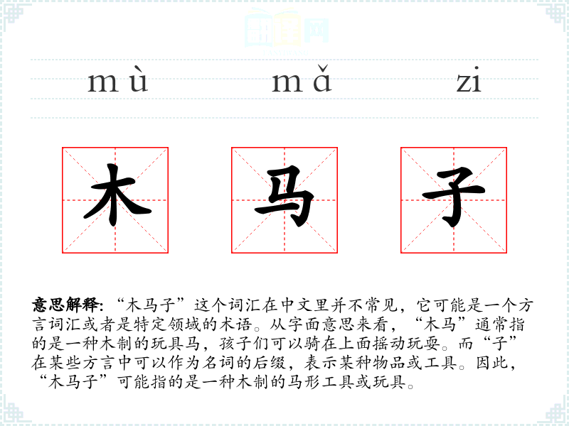 同义词:木马、木制玩具、农具 反义词:(由于“木马子”不是一个常用词汇,反义词不明显)