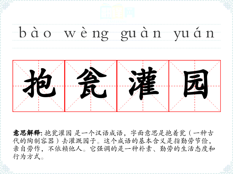 抱瓮灌园 是一个汉语成语,字面意思是抱着瓮(一种古代的陶制容器)去灌溉园子。这个成语的基本含义是指勤劳节俭,亲自劳作,不依赖他人。它强调的是一种朴素、勤劳的生活态度和行为方式。