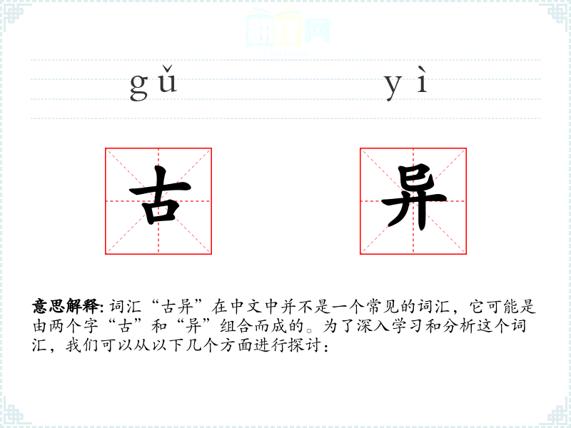 词汇“古异”在中文中并不是一个常见的词汇,它可能是由两个字“古”和“异”组合而成的。为了深入学*和分析这个词汇,我们可以从以下几个方面进行探讨: