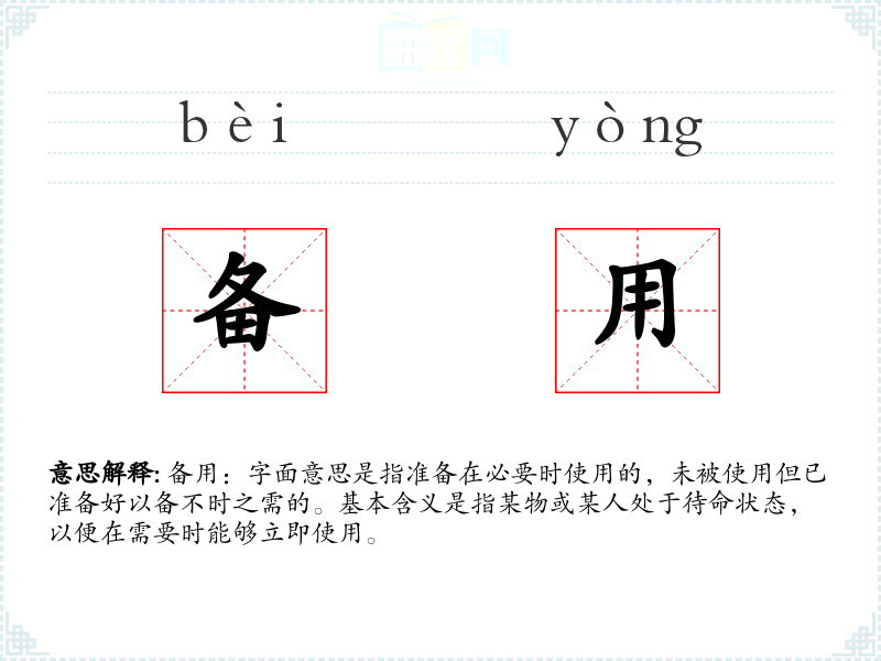 备用:字面意思是指准备在必要时使用的,未被使用但已准备好以备不时之需的。基本含义是指某物或某人处于待命状态,以便在需要时能够立即使用。