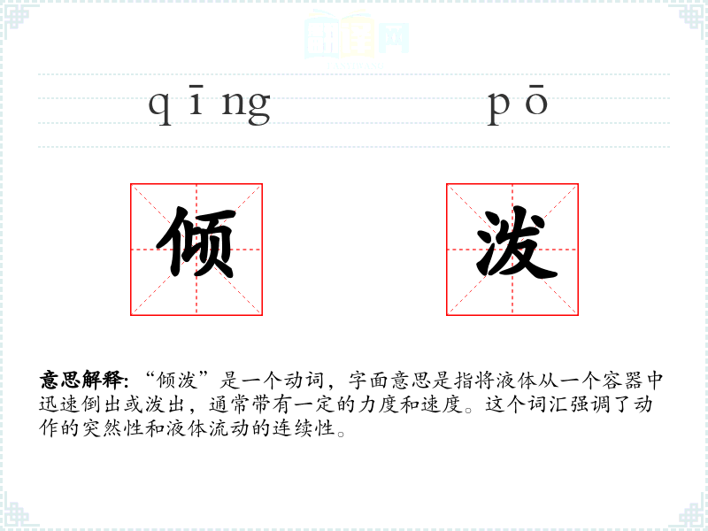 “倾泼”由“倾”和“泼”两个字组成。“倾”字古汉语中已有倾斜、倒出的意思,“泼”字则有猛烈地洒出、泼出的含义。两者结合,形成了描述液体快速倒出的动作。