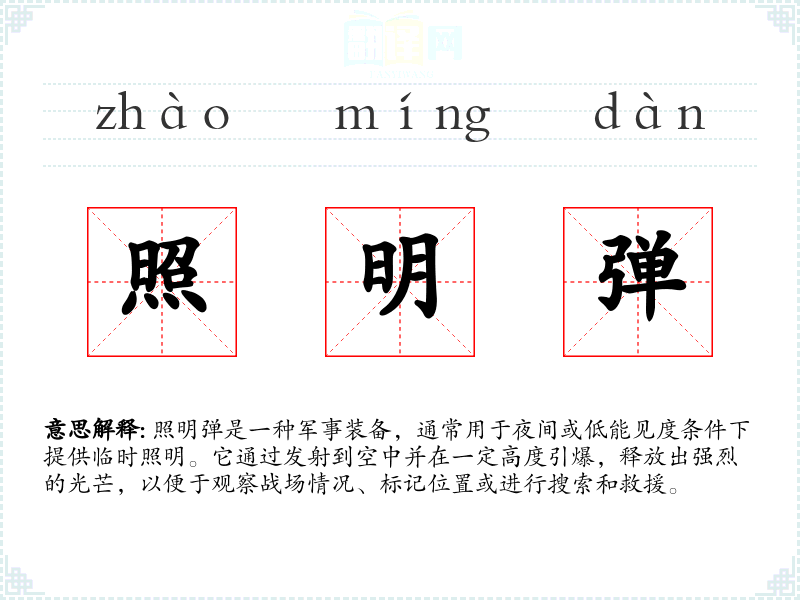 - 同义词:信号弹、闪光弹(细微差别在于信号弹更多用于传递信号,而照明弹侧重于提供照明)