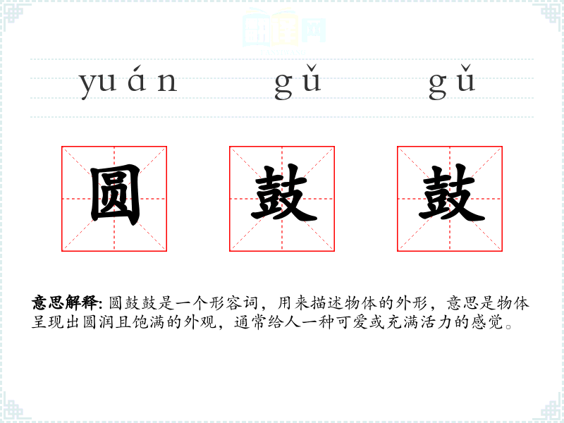 圆鼓鼓这个词由“圆”和“鼓鼓”组成,其中“圆”表示形状,“鼓鼓”则强调了饱满和膨胀的感觉。这个词在中文中的使用历史较长,但具体起源难以考证。