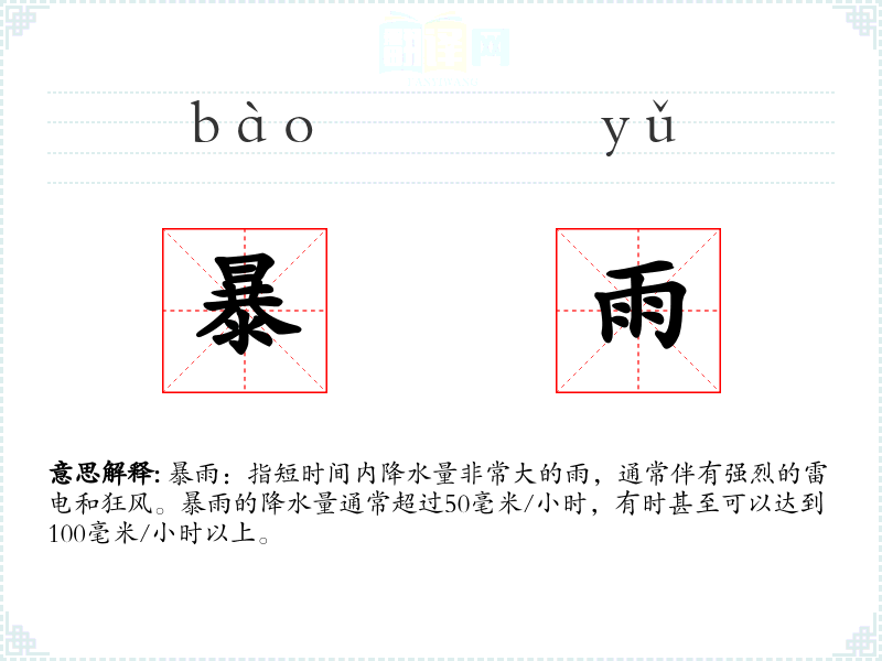 - 同义词:大雨、豪雨、雷雨