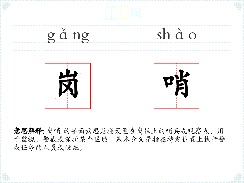岗哨 的字面意思是指设置在岗位上的哨兵或观察点,用于监视、警戒或保护某个区域。基本含义是指在特定位置上执行警戒任务的人员或设施。