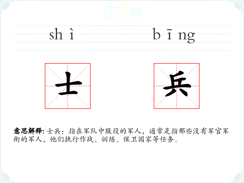 士兵:指在军队中服役的军人,通常是指那些没有军官军衔的军人,他们执行作战、训练、保卫国家等任务。