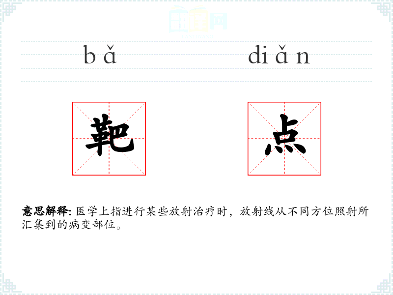 医学上指进行某些放射治疗时,放射线从不同方位照射所汇集到的病变部位。