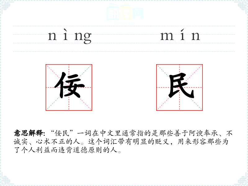 “佞民”一词在中文里通常指的是那些善于阿谀奉承、不诚实、心术不正的人。这个词汇带有明显的贬义,用来形容那些为了个人利益而违背道德原则的人。