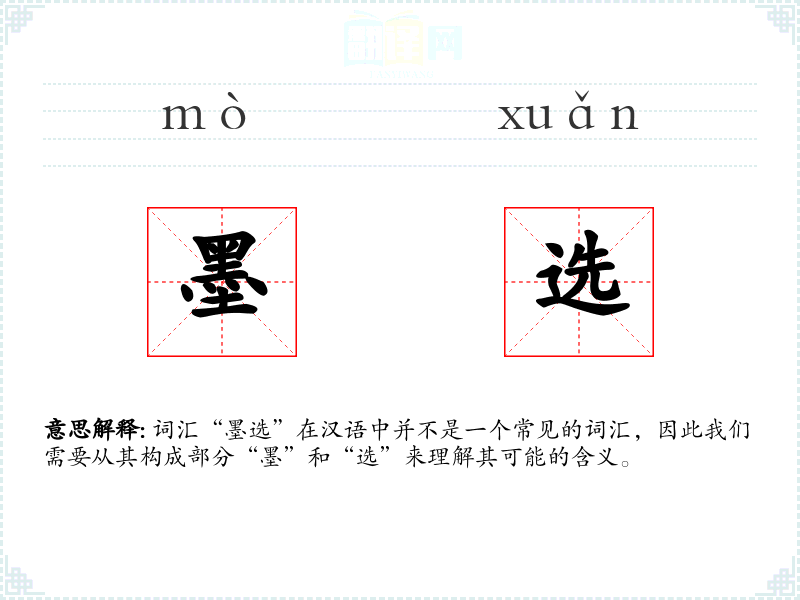 词汇“墨选”在汉语中并不是一个常见的词汇,因此我们需要从其构成部分“墨”和“选”来理解其可能的含义。