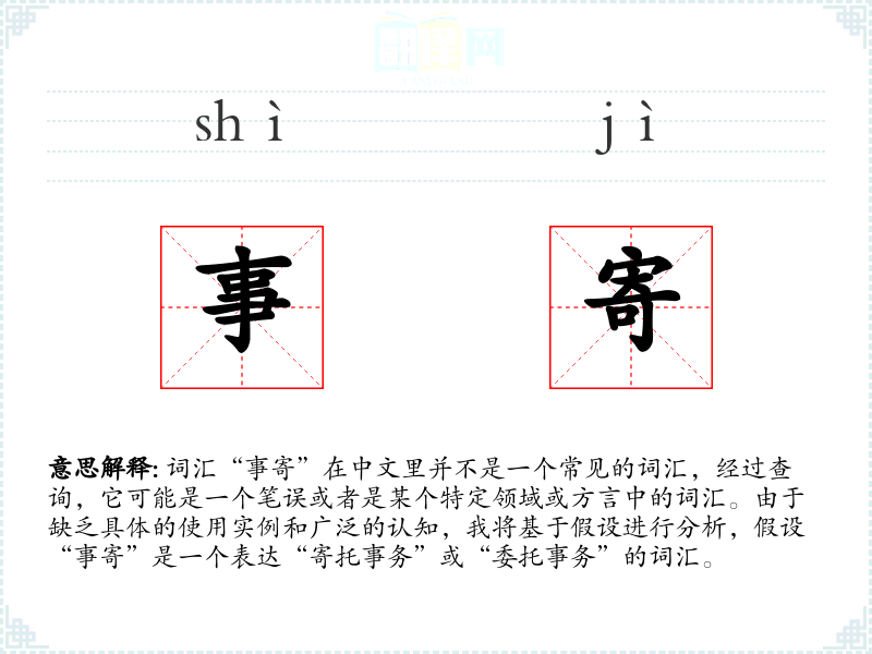 词汇“事寄”在中文里并不是一个常见的词汇,经过查询,它可能是一个笔误或者是某个特定领域或方言中的词汇。由于缺乏具体的使用实例和广泛的认知,我将基于假设进行分析,假设“事寄”是一个表达“寄托事务”或“委托事务”的词汇。