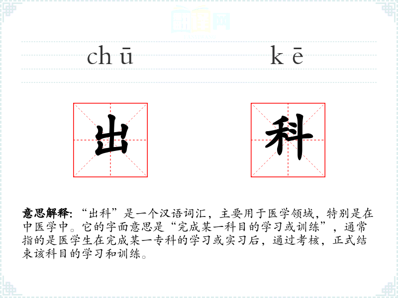 “出科”是一个汉语词汇,主要用于医学领域,特别是在中医学中。它的字面意思是“完成某一科目的学或训练”,通常指的是医学生在完成某一专科的学或实后,通过考核,正式结束该科目的学和训练。