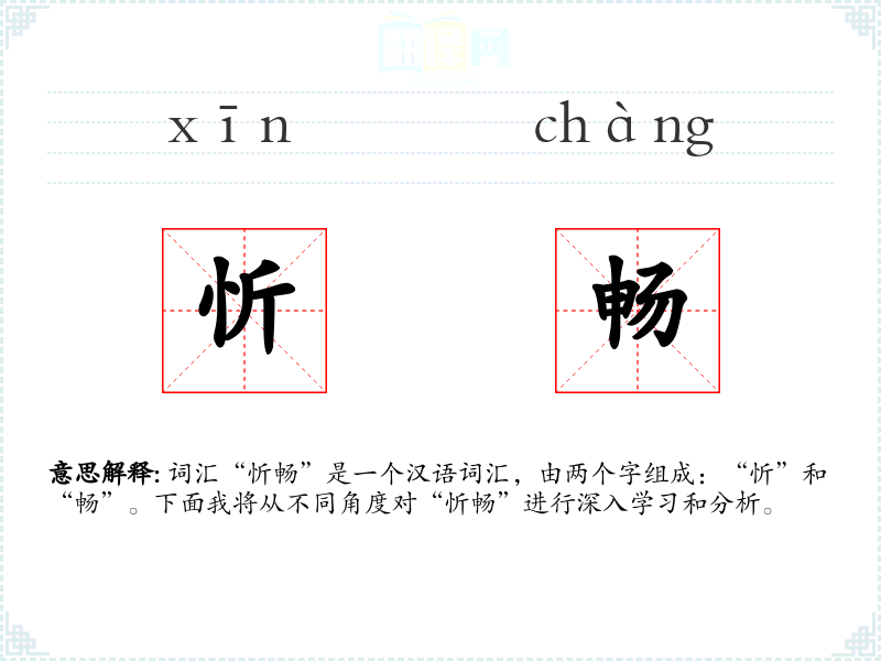 词汇“忻畅”是一个汉语词汇,由两个字组成:“忻”和“畅”。下面我将从不同角度对“忻畅”进行深入学*和分析。