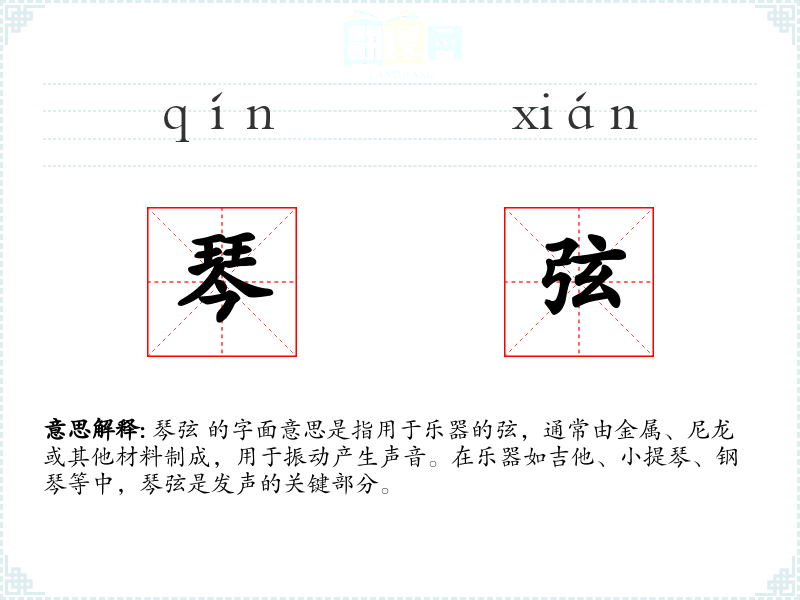 琴弦 的字面意思是指用于乐器的弦,通常由金属、尼龙或其他材料制成,用于振动产生声音。在乐器如吉他、小提琴、钢琴等中,琴弦是发声的关键部分。
