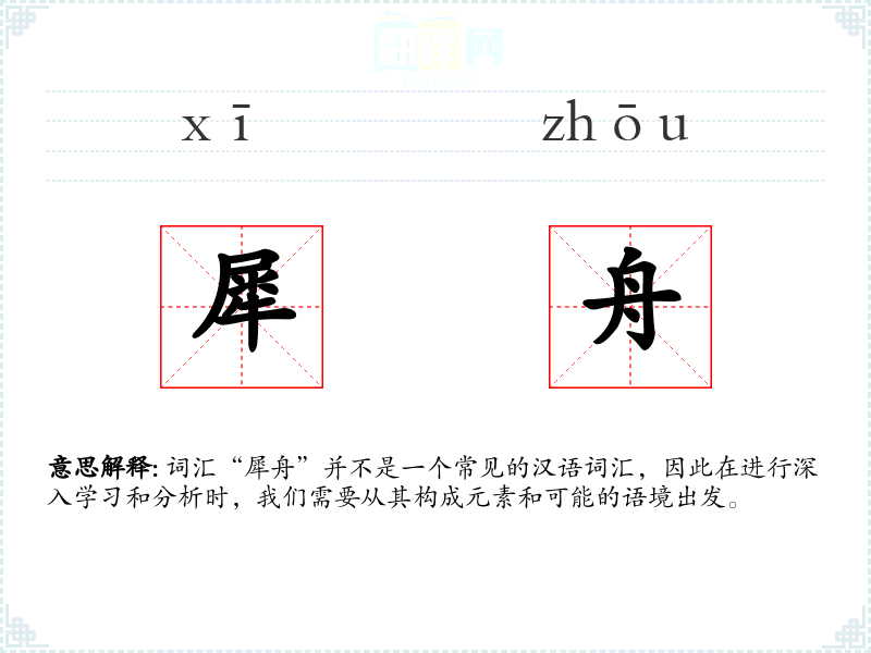 词汇“犀舟”并不是一个常见的汉语词汇,因此在进行深入学*和分析时,我们需要从其构成元素和可能的语境出发。