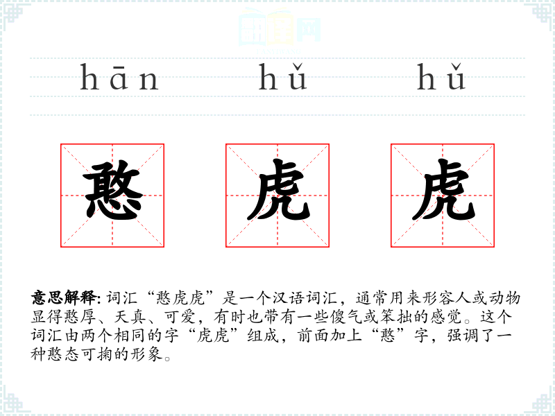 词汇“憨虎虎”是一个汉语词汇,通常用来形容人或动物显得憨厚、天真、可爱,有时也带有一些傻气或笨拙的感觉。这个词汇由两个相同的字“虎虎”组成,前面加上“憨”字,强调了一种憨态可掬的形象。