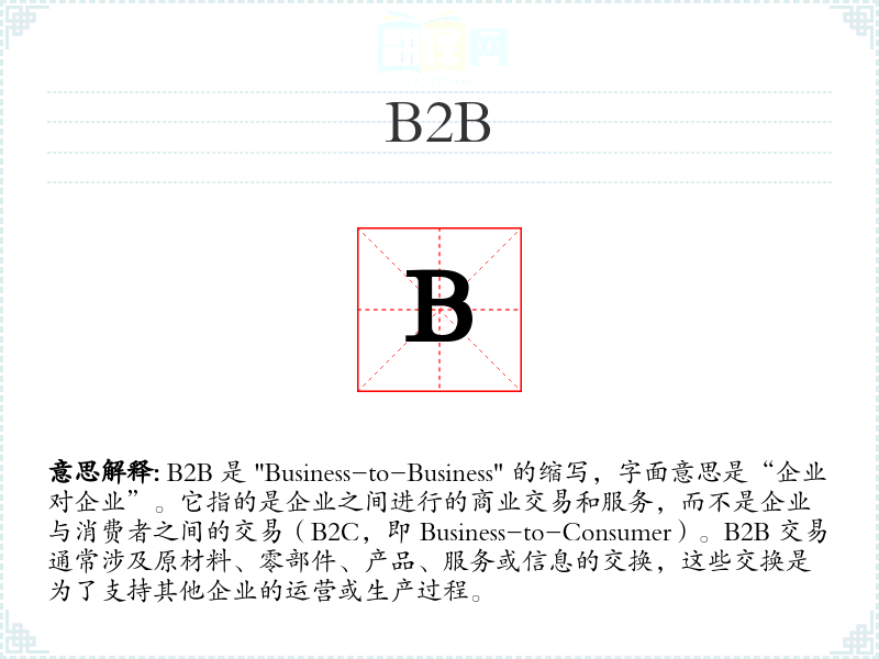 B2B 是 "Business-to-Business" 的缩写,字面意思是“企业对企业”。它指的是企业之间进行的商业交易和服务,而不是企业与消费者之间的交易(B2C,即 Business-to-Consumer)。B2B 交易通常涉及原材料、零部件、产品、服务或信息的交换,这些交换是为了支持其他企业的运营或生产过程。