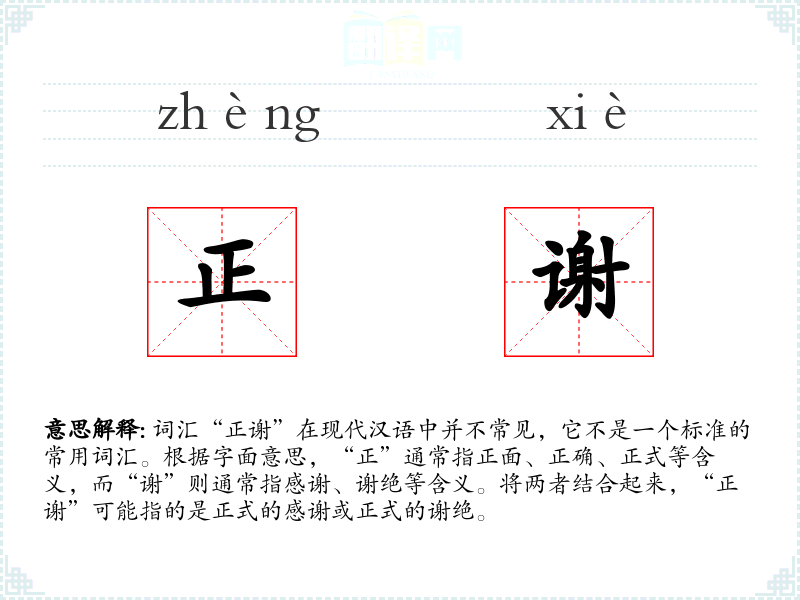 由于“正谢”不是一个常用词汇,其在不同语言或文化中的对应词汇不太明确。在英语中,可能会用“formal thanks”或“formal decline”来表达类似的意思。
