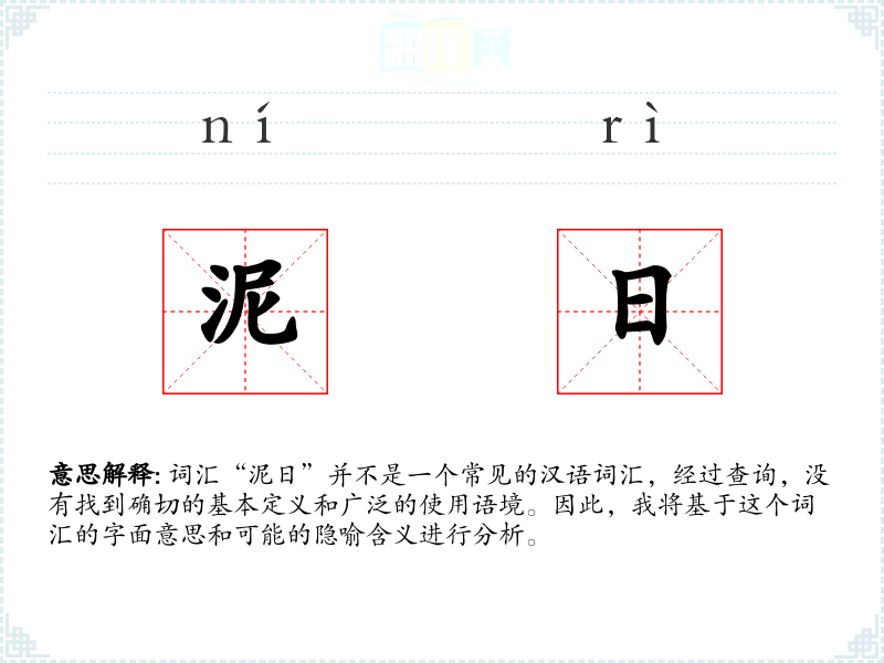 词汇“泥日”并不是一个常见的汉语词汇,经过查询,没有找到确切的基本定义和广泛的使用语境。因此,我将基于这个词汇的字面意思和可能的隐喻含义进行分析。