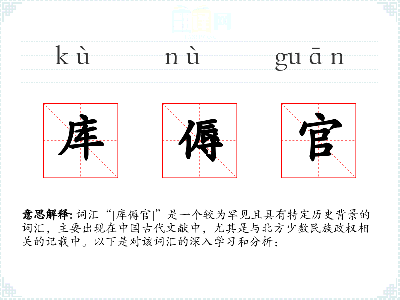 词汇“[库傉官]”是一个较为罕见且具有特定历史背景的词汇,主要出现在*古代文献中,尤其是与北方少数民族政权相关的记载中。以下是对该词汇的深入学和分析: