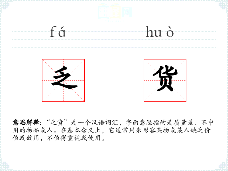 “乏货”是一个汉语词汇,字面意思指的是质量差、不中用的物品或人。在基本含义上,它通常用来形容某物或某人缺乏价值或效用,不值得重视或使用。