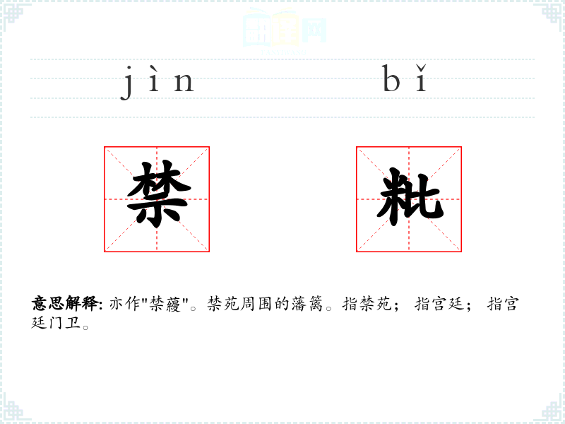 亦作"禁蘰"。禁苑周围的藩篱。指禁苑; 指宫廷; 指宫廷门卫。