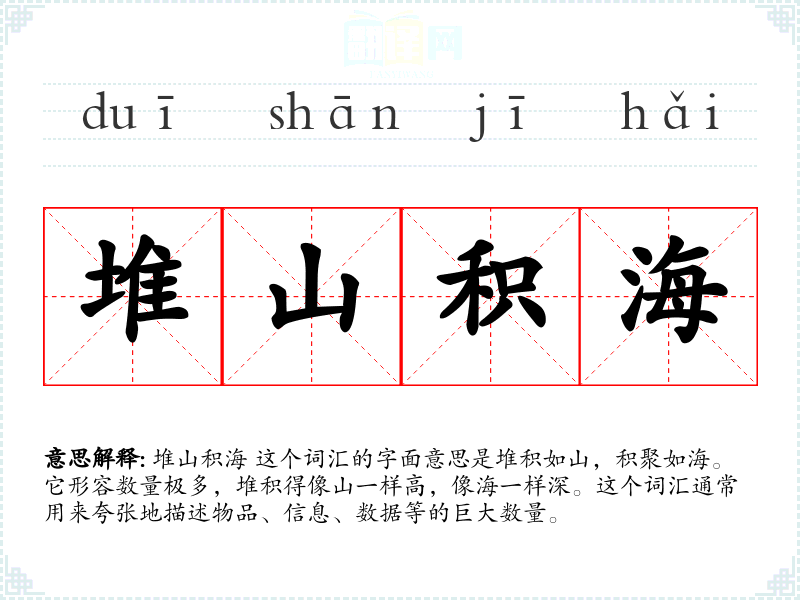 堆山积海 这个词汇的字面意思是堆积如山,积聚如海。它形容数量极多,堆积得像山一样高,像海一样深。这个词汇通常用来夸张地描述物品、信息、数据等的巨大数量。