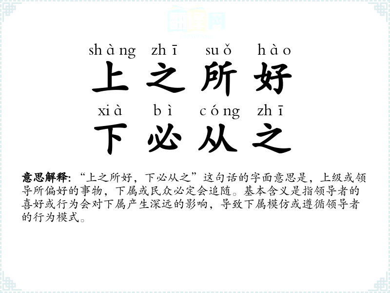 “上之所好,下必从之”这句话的字面意思是,上级或领导所偏好的事物,下属或民众必定会追随。基本含义是指领导者的喜好或行为会对下属产生深远的影响,导致下属模仿或遵循领导者的行为模式。