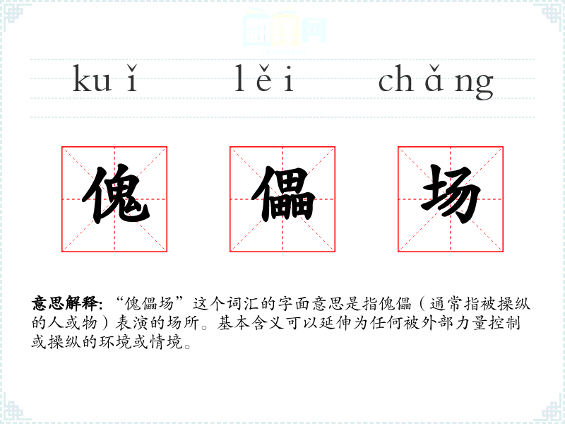 “傀儡场”这个词汇的字面意思是指傀儡(通常指被操纵的人或物)表演的场所。基本含义可以延伸为任何被外部力量控制或操纵的环境或情境。