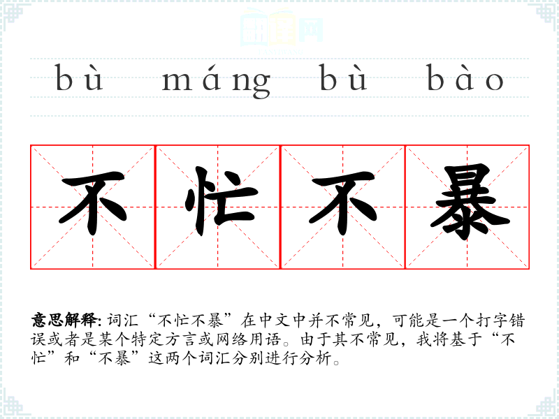 词汇“不忙不暴”在中文中并不常见,可能是一个打字错误或者是某个特定方言或网络用语。由于其不常见,我将基于“不忙”和“不暴”这两个词汇分别进行分析。