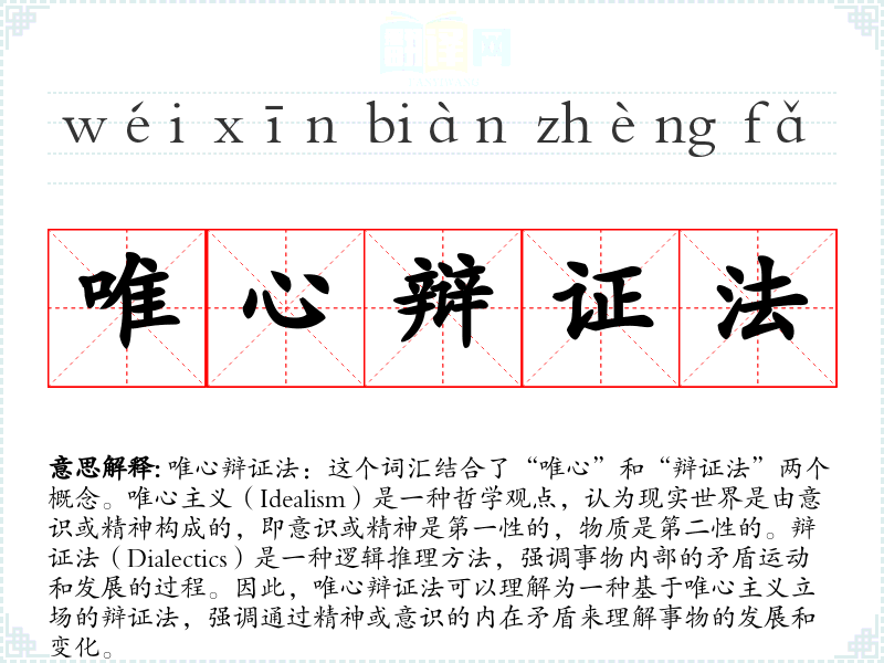 在哲学领域,唯心辩证法通常与黑格尔的哲学体系相关,黑格尔的辩证法是唯心主义的,他认为历史和现实是通过精神或理念的内在矛盾**而发展的。在文学和口语中,这个词汇可能不太常见,但在专业哲学讨论中,它是一个重要的概念。