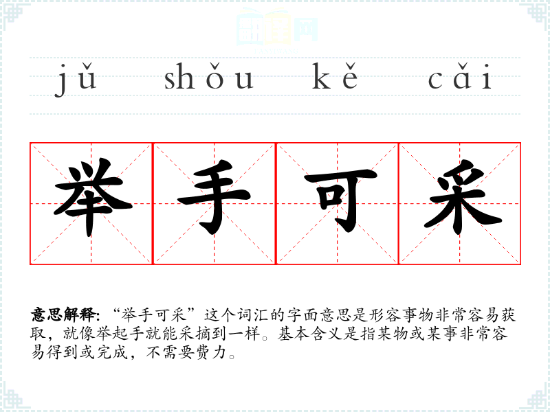 “举手可采”这个词汇的字面意思是形容事物非常容易获取,就像举起手就能采摘到一样。基本含义是指某物或某事非常容易得到或完成,不需要费力。