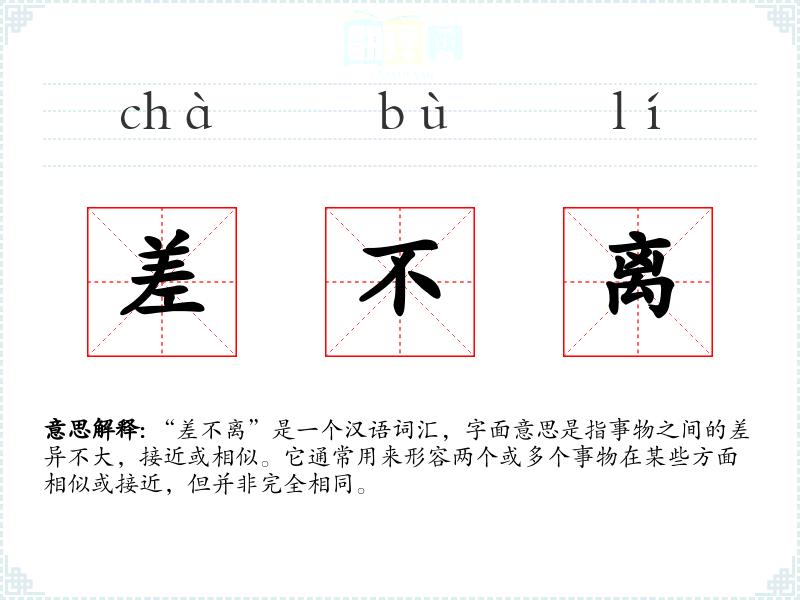 “差不离”是一个汉语词汇,字面意思是指事物之间的差异不大,接近或相似。它通常用来形容两个或多个事物在某些方面相似或接近,但并非完全相同。