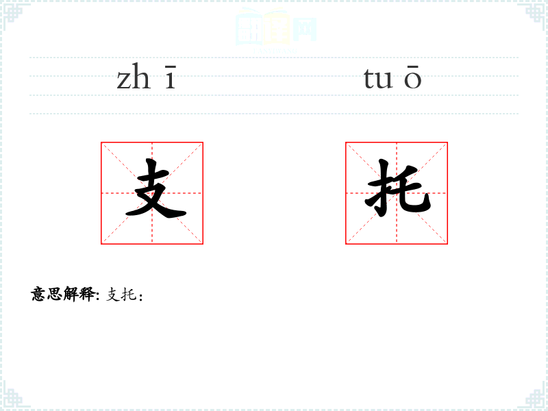 - 词源:“支托”由两个汉字组成,“支”意为支撑,“托”意为托住。