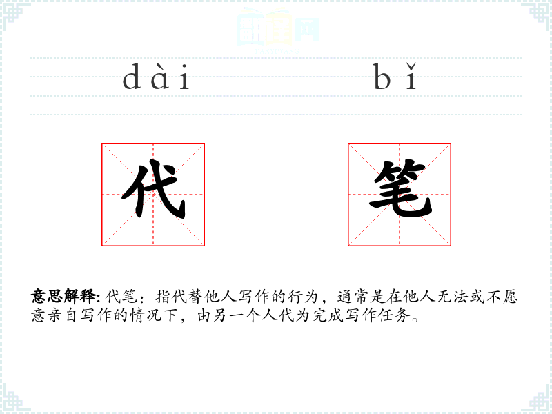 代笔:指代替他人写作的行为,通常是在他人无法或不愿意亲自写作的情况下,由另一个人代为完成写作任务。