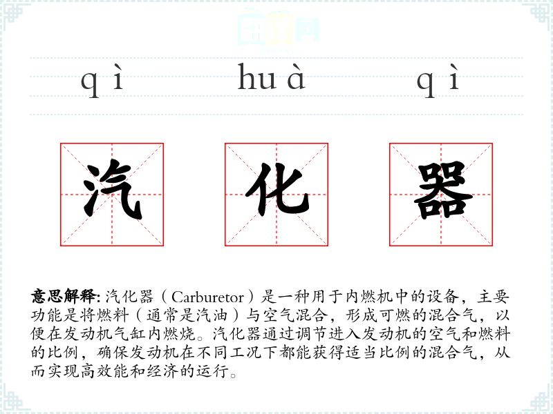 同义词:燃油喷射器(在现代汽车中替代汽化器的设备) 反义词:无直接反义词,但可以考虑“纯空气”作为反义,因为汽化器的作用是混合燃料和空气。