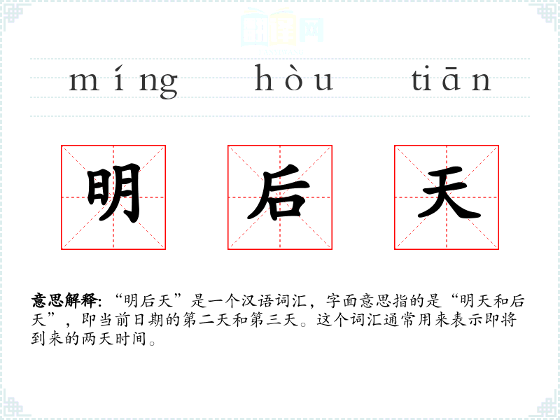 “明后天”这个词汇在汉语中历史悠久,其结构简单明了,由“明”(明天)和“后”(后天)两个词组合而成,没有复杂的词源或演变过程。