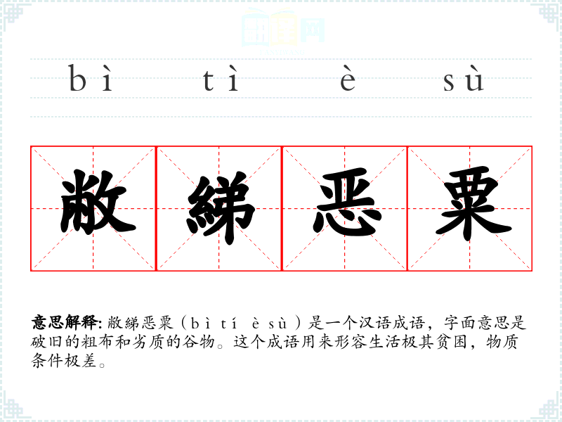 敝綈恶粟(bì tí è sù)是一个汉语成语,字面意思是破旧的粗布和劣质的谷物。这个成语用来形容生活极其贫困,物质条件极差。