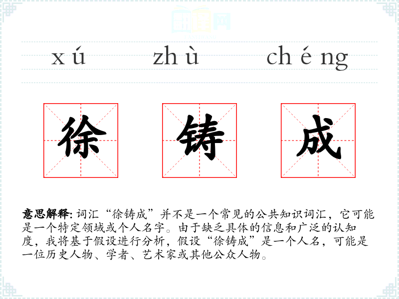 词汇“徐铸成”并不是一个常见的公共知识词汇,它可能是一个特定领域或个人名字。由于缺乏具体的信息和广泛的认知度,我将基于假设进行分析,假设“徐铸成”是一个人名,可能是一位历史人物、学者、艺术家或其他公众人物。