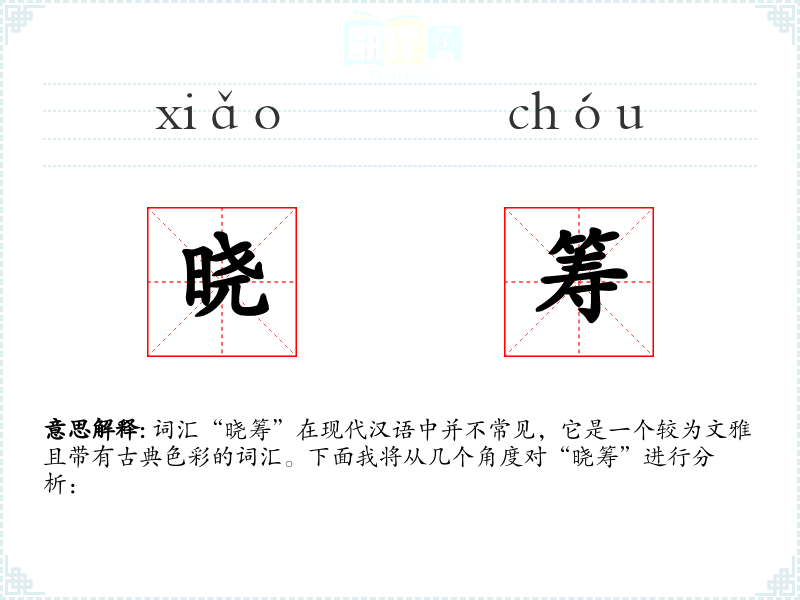 词汇“晓筹”在现代汉语中并不常见,它是一个较为文雅且带有古典色彩的词汇。下面我将从几个角度对“晓筹”进行分析:
